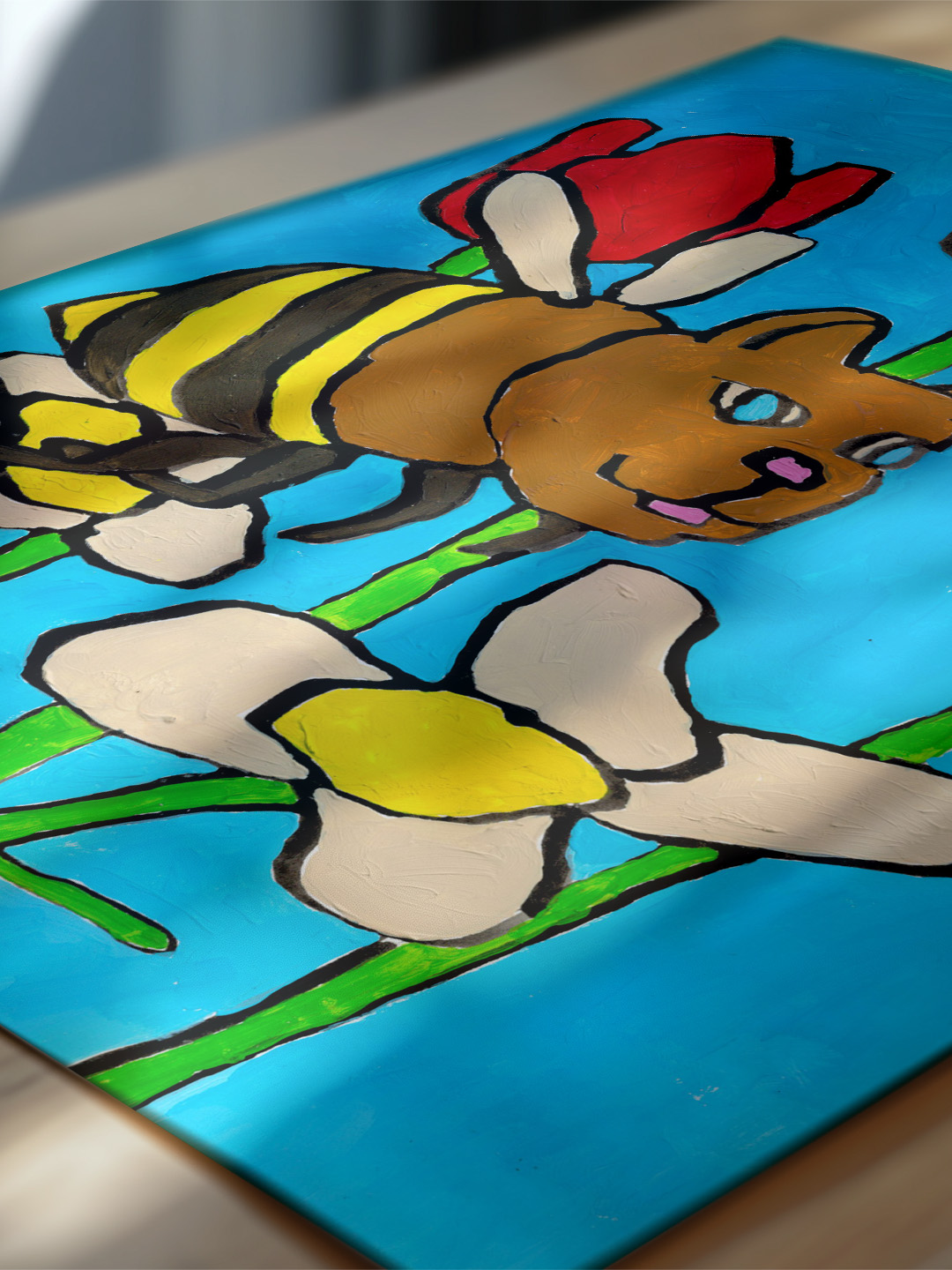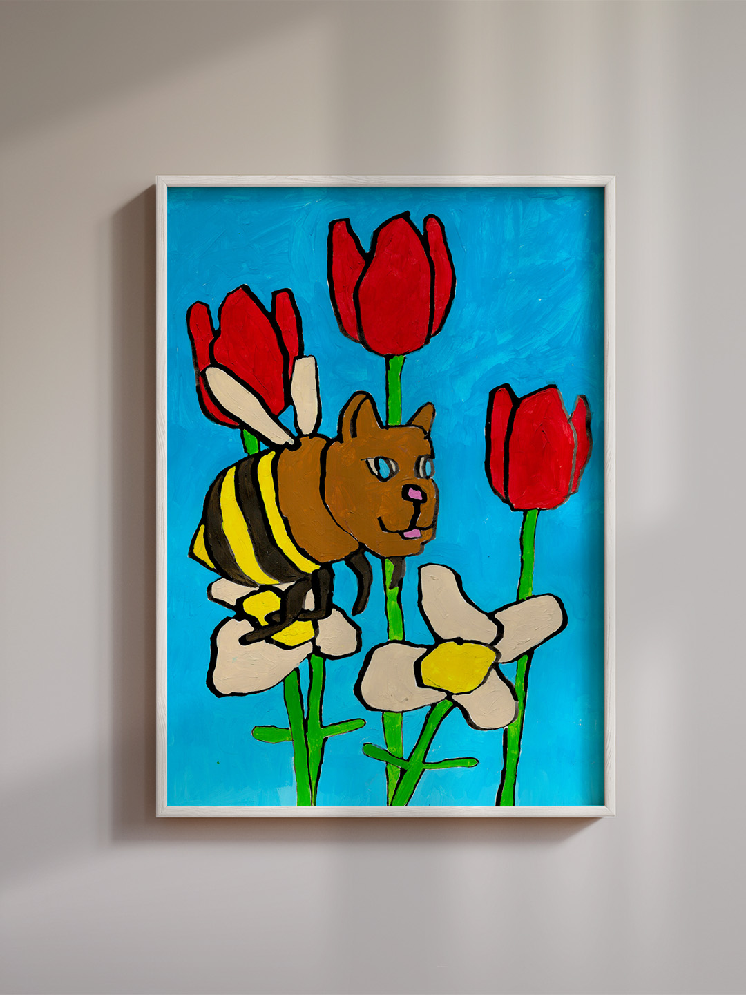 another rare sighting of the elusive bee-cat: part pollinator, part predator, possibly purring. set against a blue-sky backdrop with flowers standing by, unsure what they’ve witnessed.