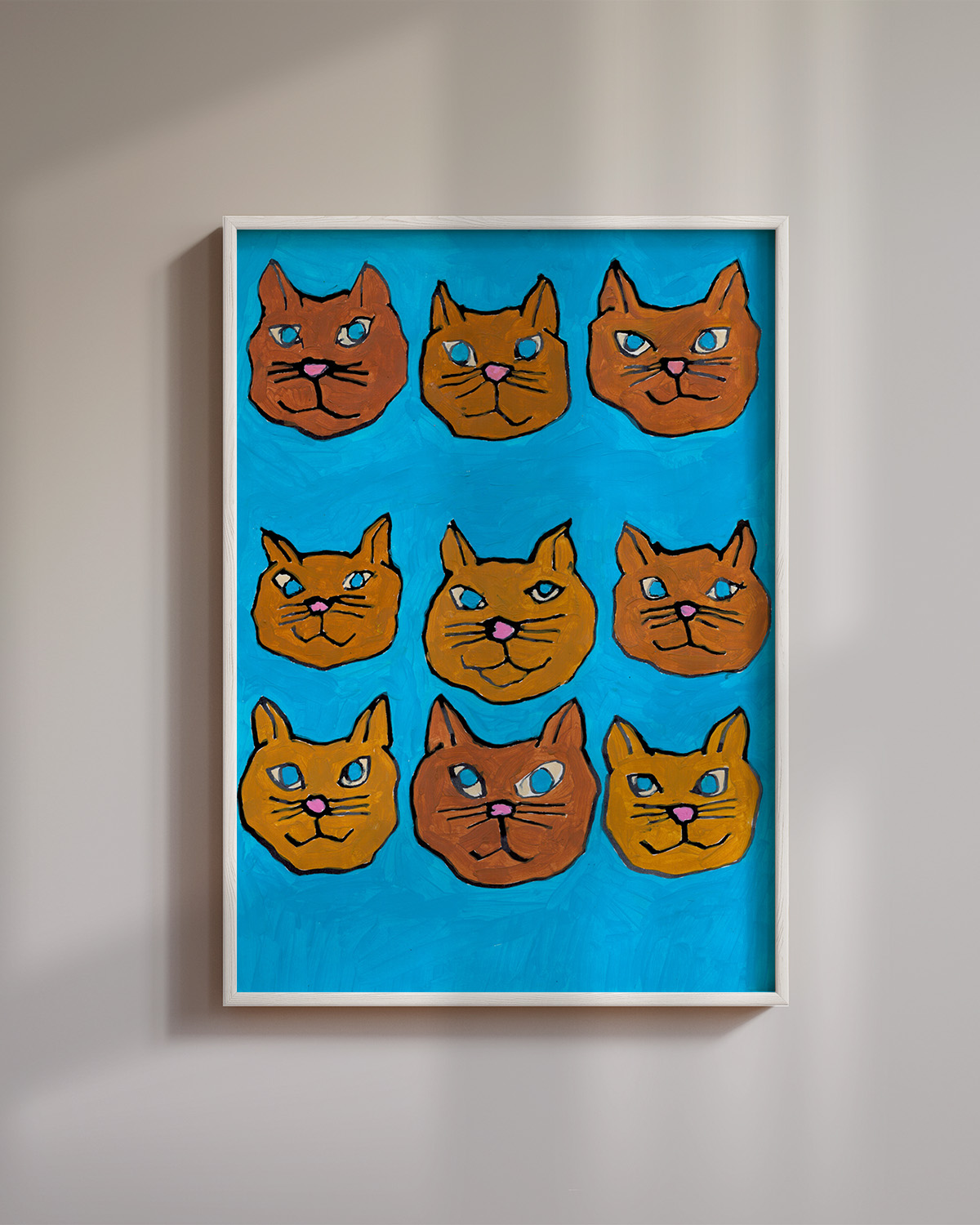 Hand-drawn using acrylic and ink on A3 (140gsm) paper. Each piece is unique, but all are united in their commitment to maximum cat content per square inch
