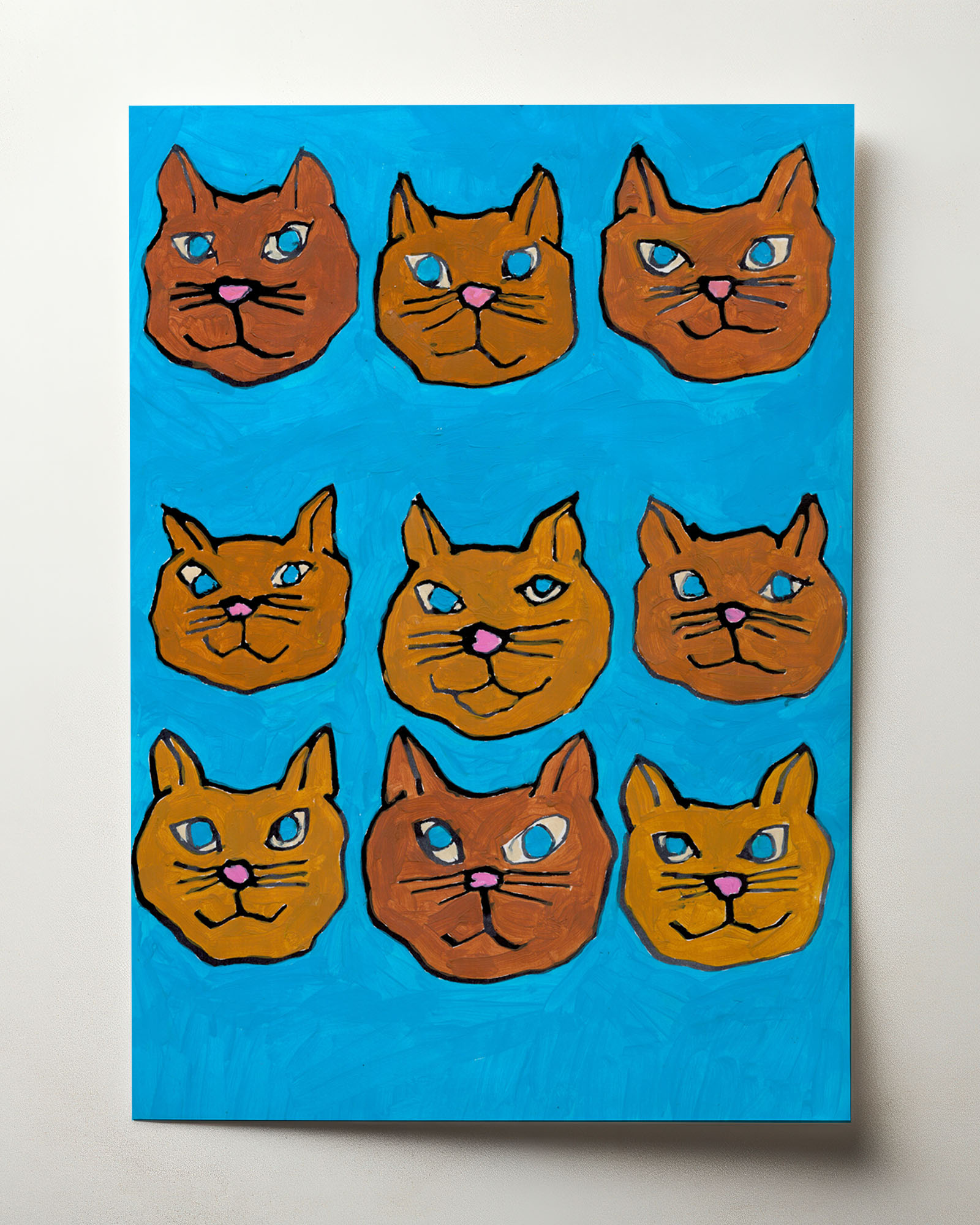 One of a series of nine original drawings, each featuring nine cat faces rendered in a deliberately naïve style 😺 somewhere between folk art and low-res feline emoji