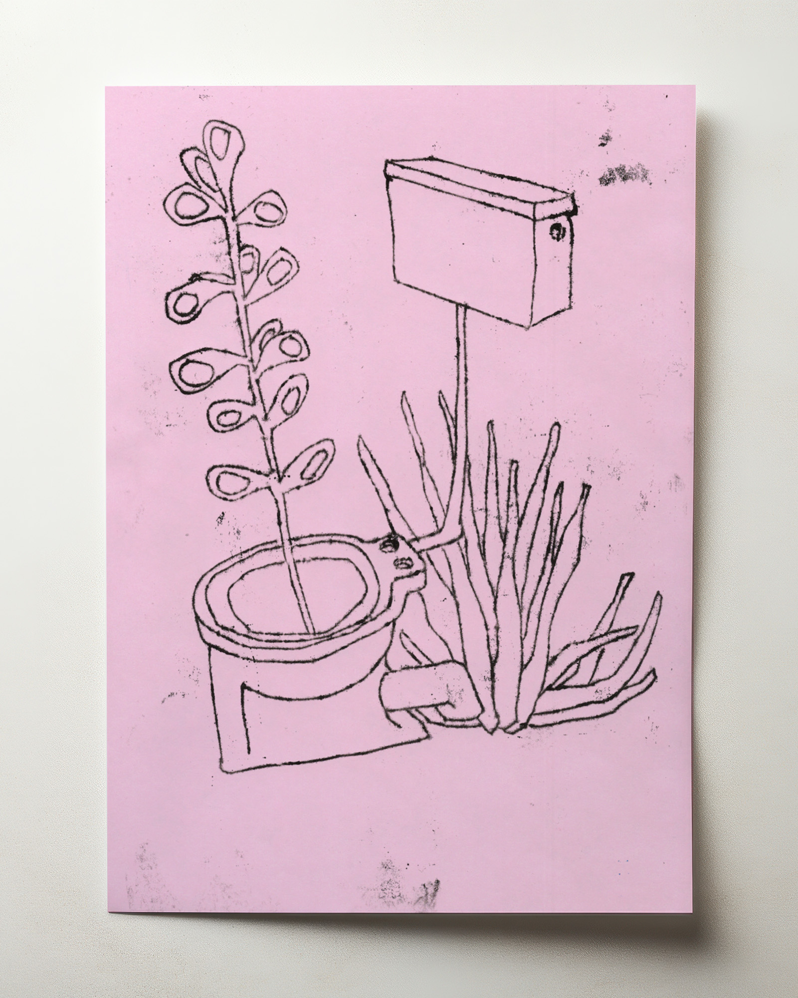 Flush your preconceptions down the drain with these cheeky original monoprints! Each one-of-a-kind artwork showcases a toilet unexpectedly repurposed as nature’s own planter, with lush greenery sprouting defiantly from the porcelain bowl.